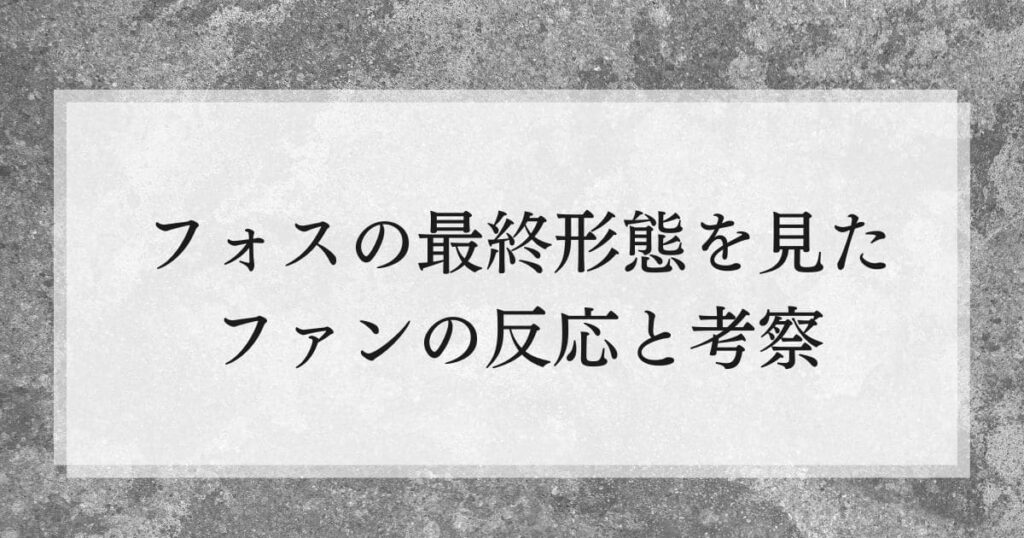 フォスの壮絶な変遷と、最終形態の神々しい姿は、ぜひ作品本編の圧倒的な映像美と作画で確認してほしいポイントです。