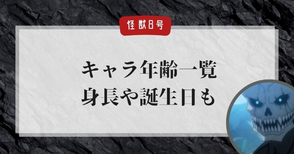 アニメ化もされ、世界中で話題沸騰中の漫画『怪獣8号』。 主人公がおじさんという珍しい設定ですが、各キャラクターの年齢や詳細なプロフィールが気になっている方も多いのではないでしょうか? この記事では、怪獣8号のキャラ年齢や誕生日、身長などの公... -